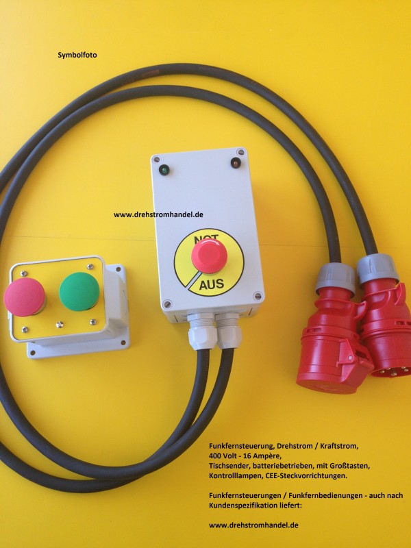 Funkfernsteuerung / Funkfernbedienung, mit Schnell-AUS-Schalter im Basisgerät, für Drehstrom / Kraftstrom zur Steuerung geeigneter Geräte, 400 Volt / 16 Ampère komplett mit Gummischlauchleitungen und CEE-Steckern, geprüft und sofort einsatzbereit.