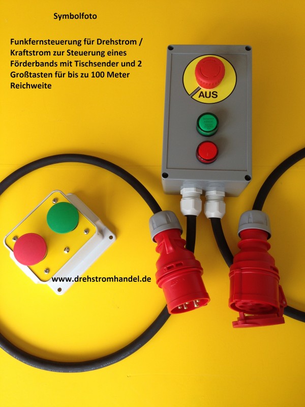 Funkfernsteuerung für Drehstrom / Kraftstrom mit Großtasten-Tischsender, batteriebetrieben - zur Steuerung geeigneter Geräte, 400 Volt / 16 Ampère komplett mit Gummischlauchleitungen und CEE-Steckern,