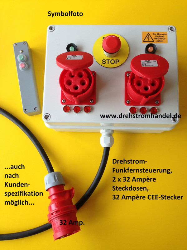 Funkfernsteuerung für Drehstrom / Kraftstrom zur Steuerung geeigneter Geräte, 400 Volt / 2 x 32 Ampère Steckdose, komplett mit Gummischlauchleitung und 32 Ampère-CEE-Stecker, geprüft und sofort einsatzbereit.