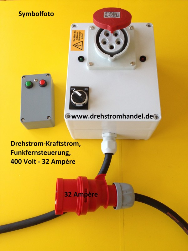 Für Drehstrom / Kraftstrom - zur Steuerung geeigneter Geräte, 400 Volt / 32 Ampère, komplett mit Gummischlauchleitung und CEE-Stecker, geprüft und sofort einsatzbereit.