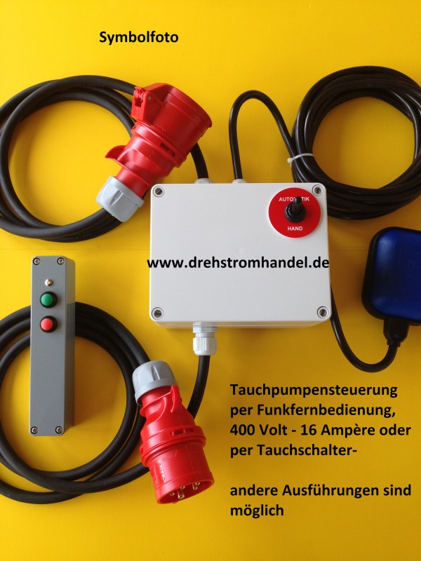 Funkfernsteuerung für eine Tauchpumpe, Drehstrom, 400 Volt - 16 Ampère - wahlweise über Funkfernbedienung / Schwimmerschalter.