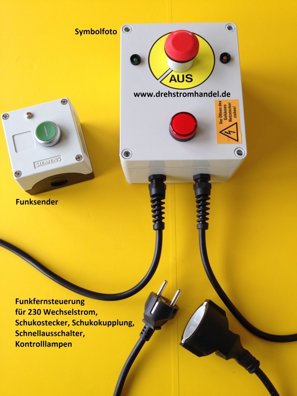 Funkfernsteuerung für 230 Volt Wechselstrom, Schnellausschalter im Basisgerät, zur Steuerung geeigneter Geräte, Schukostecker, Schukokupplung, 16 Ampère, geprüft und sofort einsatzbereit. Kontrolllampen. Tischsender, batteriebetrieben.