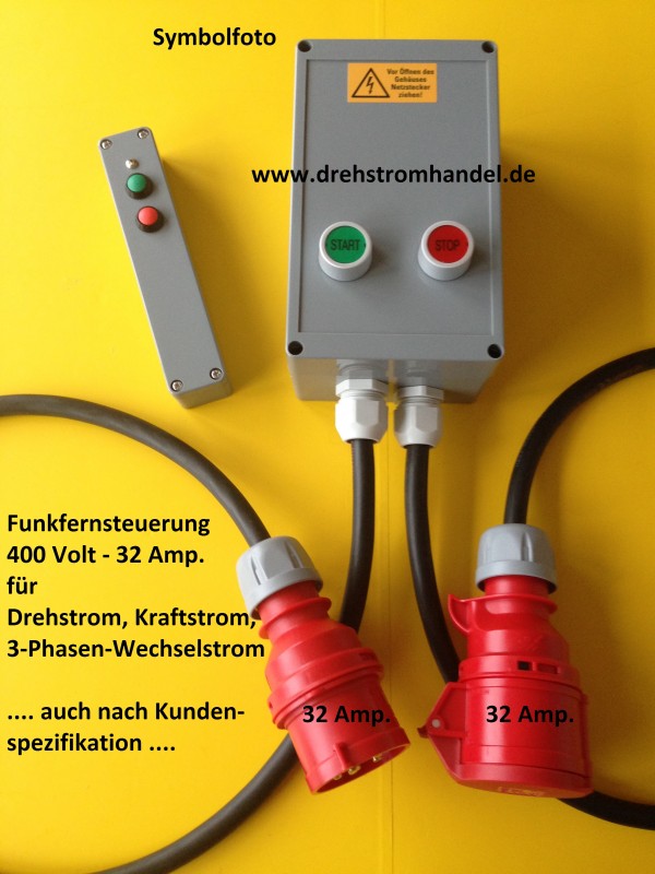 Funkfernsteuerung für Drehstrom / Kraftstrom mit Ausschaltfunktion im Basisgerät zur Steuerung geeigneter Geräte, 400 Volt / 32 Ampère komplett mit Gummischlauchleitungen und CEE-Steckern,