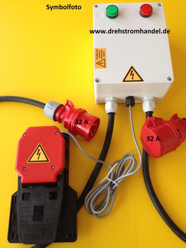 Leitungsgebundener Fußschalter für Drehstromanwendungen, 400 Volt / 32 Ampère, zur Steuerung geeigneter Geräte, welche mit Drehstrom betrieben werden.