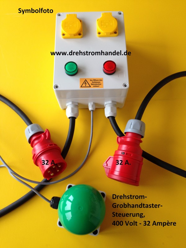 Drehstrom-Grobhandtaster-Steuerung zur Betätigung eines Geräts per Tastendruck. Einmal drücken = EIN, nochmaliges drücken = AUS. 2 Schukosteckdosen - ebenfalls über den Grobhandtaster betätigt. Kontrolllampen.