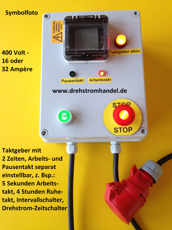 Intervallsteuerung, Zeitschaltuhr mit 2 separaten Zeiten im Endlosbetrieb, Taktgeber für Drehstrom, 400 Volt - 16 Amp.