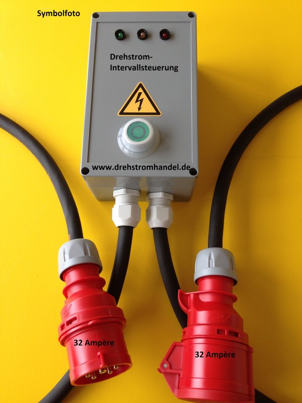 Intervallsteuerung / Intervallschalter für Drehstrom / Kraftstrom zur Steuerung geeigneter Geräte, 400 Volt / 32 Ampère, komplett mit Gummischlauchleitungen und CEE-Steckern, Kontrolllampen, geprüft und sofort einsatzbereit.
