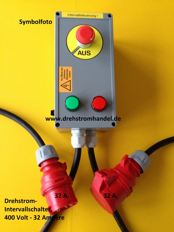 Intervallsteuerung für Drehstrom / Kraftstrom zur Steuerung von Drehstrommotoren, Rührwerken, Poliergeräten, Mischern u.a. - für Drehstrom 400 Volt / 32 Ampère komplett mit Gummischlauchleitungen und CEE-Steckern, geprüft und sofort einsatzbereit. Intervallzeiten können durch den Kunden verändert werden: separat einstellbare Arbeits- und Pausenzeiten.