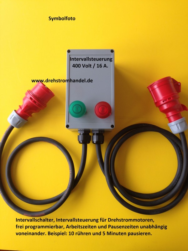 Intervallsteuerung für Drehstrom / Kraftstrom zur Steuerung von Drehstrommotoren, Rührwerken, Poliergeräten, Mischern u.a. - für Drehstrom 400 Volt / 16 Ampère komplett mit Gummischlauchleitungen und CEE-Steckern, geprüft und sofort einsatzbereit. Intervallzeiten können durch den Kunden verändert werden.
