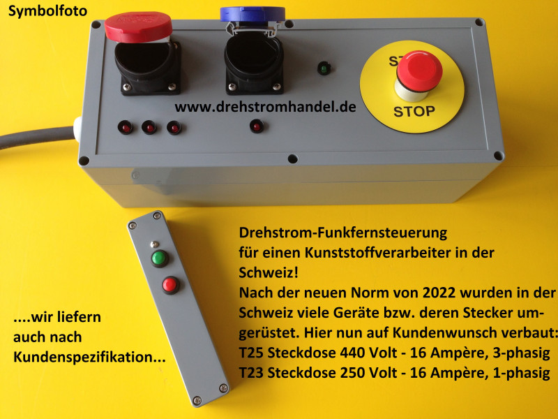 Speziell für die Schweiz: Drehstrom-Funkfernsteuerung mit Schweizer T25 und T23 Steckdosen, 250/440 Volt / 16 Ampère und