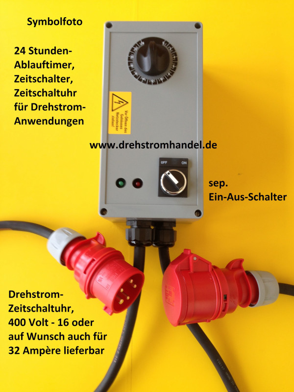 Drehstrom-Ablauftimer zur zeitverzögerten Abschaltung von Geräten, welche per Wechselstrom 400 Volt / 16 Ampère betrieben werden. Timer mit bis zu 24 Stunden Laufzeit.