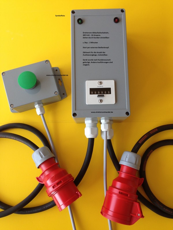 Drehstrom-Zeitschaltuhr als Ablaufzeitschaltuhr zum sicheren Ausschalten von Anlagen oder Anlagenteilen, welche mit Drehstrom 400 Volt betrieben werden. Die Zeitschaltuhr wird auf die gewünschte Zeitdauer eingeschaltet - 30 Sekunden oder 2 Minuten oder 5 Minuten oder jede andere Zeitdauer: Sekunden, Minuten, Stunden... Nach Zeitablauf wird der angeschlossene Verbraucher sicher abgeschaltet. Zählwerk, rückstellbar, zur Zählung der Auslösevorgänge. Auslösung der Zeitintervalle über die externe Starttaste.