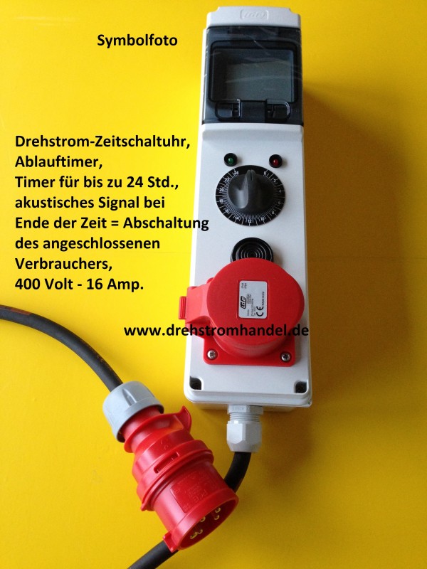 Drehstrom-Zeitschaltuhr als Ablaufzeitschaltuhr zum sicheren Ausschalten von Anlagen oder Anlagenteilen, welche mit Drehstrom 400 Volt / 16 Ampère betrieben werden. Die Zeitschaltuhr wird auf die gewünschte Zeitdauer eingeschaltet - nach Zeitablauf wird der angeschlossene Verbraucher sicher abgeschaltet. Dieses Modell hat eine Laufzeit bis zu 24 Stunden, andere Zeiten - kürzer oder länger - sind möglich. Lauter akustischer Alarm am Ende der Zeit, Dauer einstellbar.