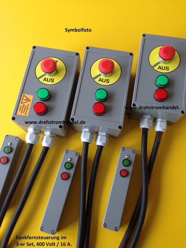 3-er Set Funkfernsteuerungen / Funkfernbedienung für Drehstrom / Krafstrom zur Bedienung von geeigneten Geräten, Aggregaten, Zubehörteilen per Funk. Drehstrom 400 Volt / 16 Ampère zur Schaltung von geeigneten Geräten.