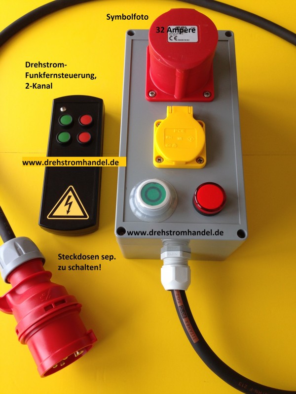 Drehstrom-Funkfernsteuerung mit CEE-Steckvorrichtung, 230 Volt + 400 Volt / 32 Ampère und Schnellausschalter