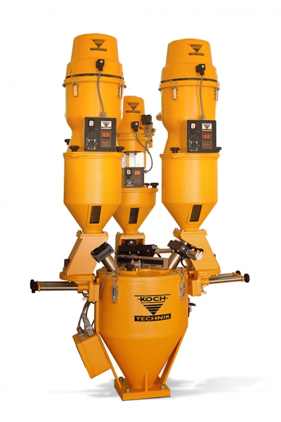 Koch modular system, direct dyeing units, pre-mixer, batch-mixer, gravimetric dosing units, volumetric dosing units, directfeet units, dosing stations for grain, powder and/or regrind, loss-in-weight dosing units, direct coloring units, very small compact conveyors, compact-conveyors, single conveyors, two materials conveyors and -hopper loaders, complete central conveying systems, hopper loaders, granulate dryers - mobile or fixed, monitoring software, metal seperators, material distribution systems, connection units